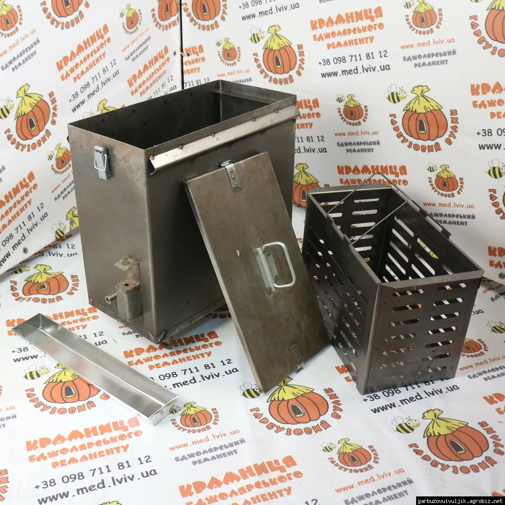 Характеристика приладу. Воскотопка складається з: корпусу з кришкою, корзини для рамок з сушшю, внутрішнього піддону для збору та відводу назовні воску. В комплект поставки включається термометр для контролю температури всередині воскотопки в процесі переробки воскової сировини.